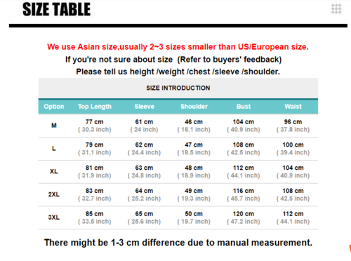 Note:We use Asian size,usually 2~3 sizes smaller than US/European size.